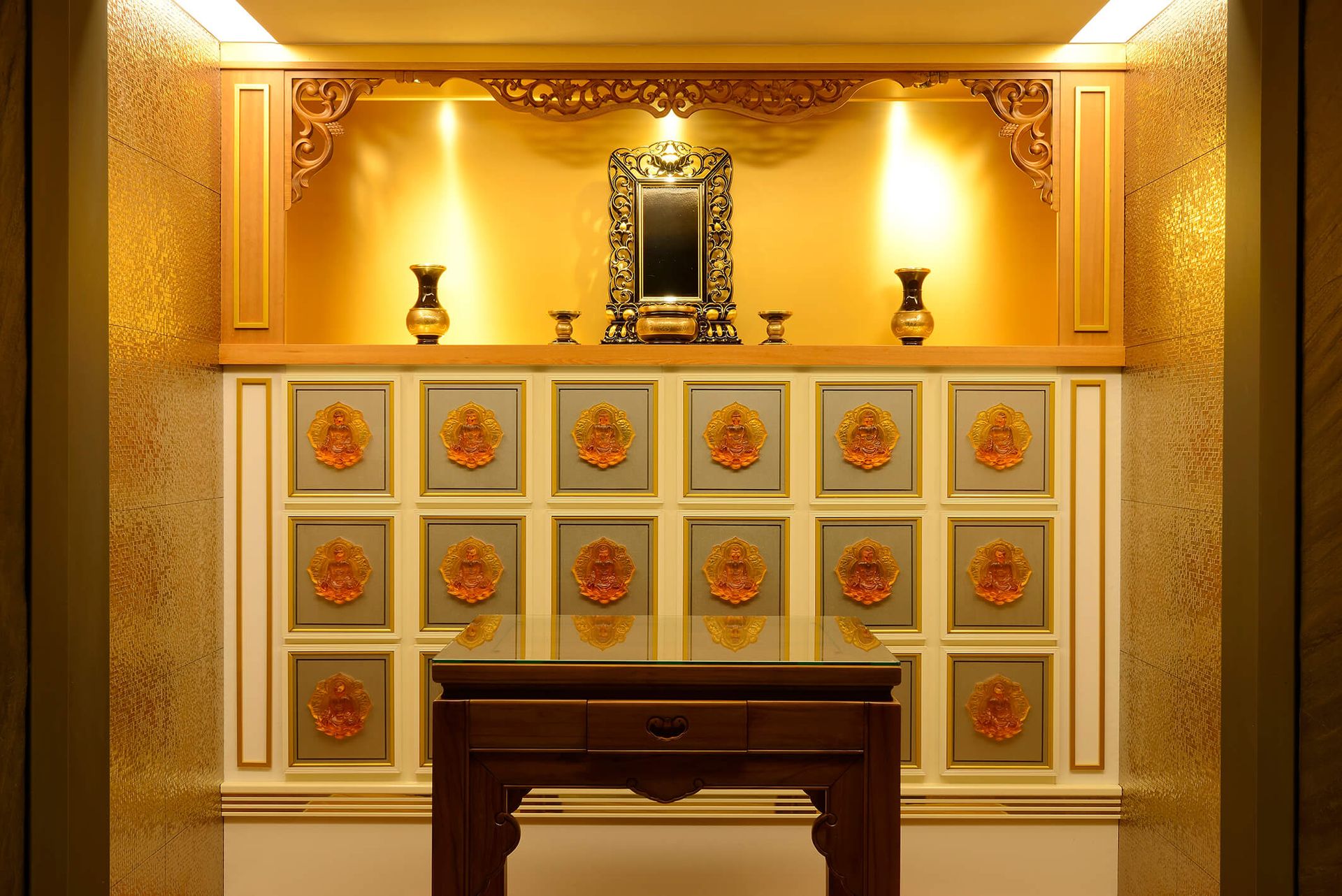 .懷恩祠以宗祠的概念設計,分A、B、C區三種不同產品,每戶皆有獨立空間、公共庭院造景及名師藝術雕像裝飾,