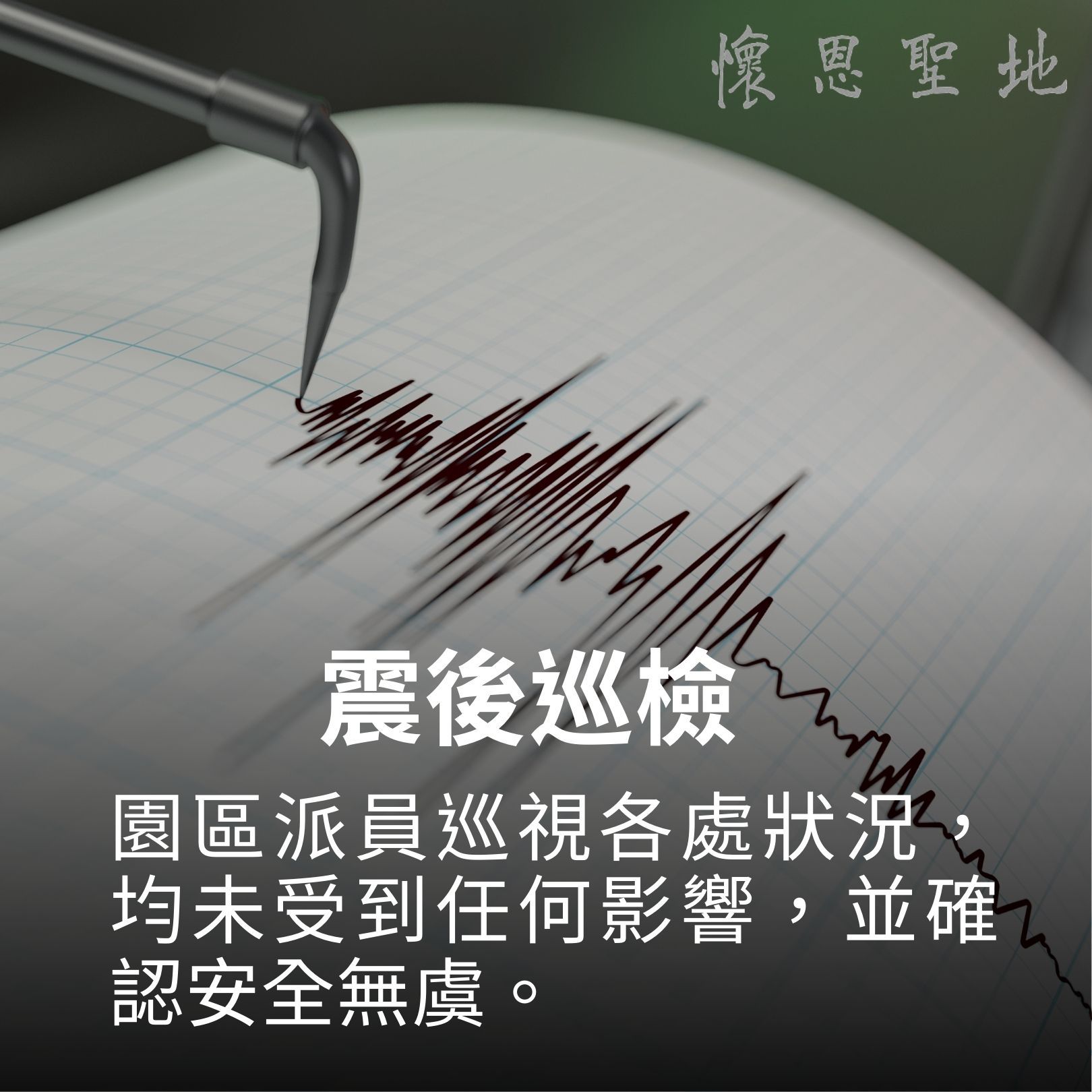 今日上班同仁震後巡檢,檢視園區內外、各塔區、牌位區。